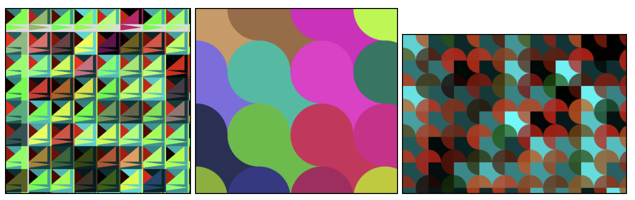 <figure><img src="https://3365989970-files.gitbook.io/~/files/v0/b/gitbook-x-prod.appspot.com/o/spaces%2F6CpkJAKaYOwA5TCz4W7l%2Fuploads%2FBCwroKz6vqdcrXAA9PCu%2Fimage.png?alt=media&#x26;token=11ea0409-a578-4c12-8bbf-2b0467d8d0f0" alt=""><figcaption><p>Example of three outputs with colorful geometric designs made up of several shapes.</p></figcaption></figure>
