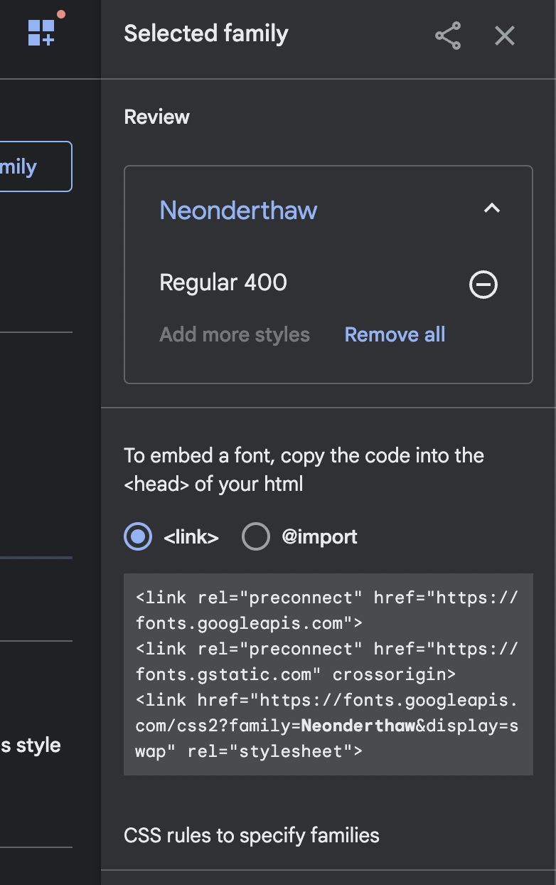 <link href="https://fonts.googleapis.com/css2?family=Neonderthaw&display=swap" rel="stylesheet">